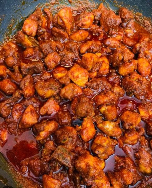 Ingredients -chicken boneless,red chillies,red chilli powder,garlic, ginger ,termeric powder, curry leaves,tomato puree Oil,salt